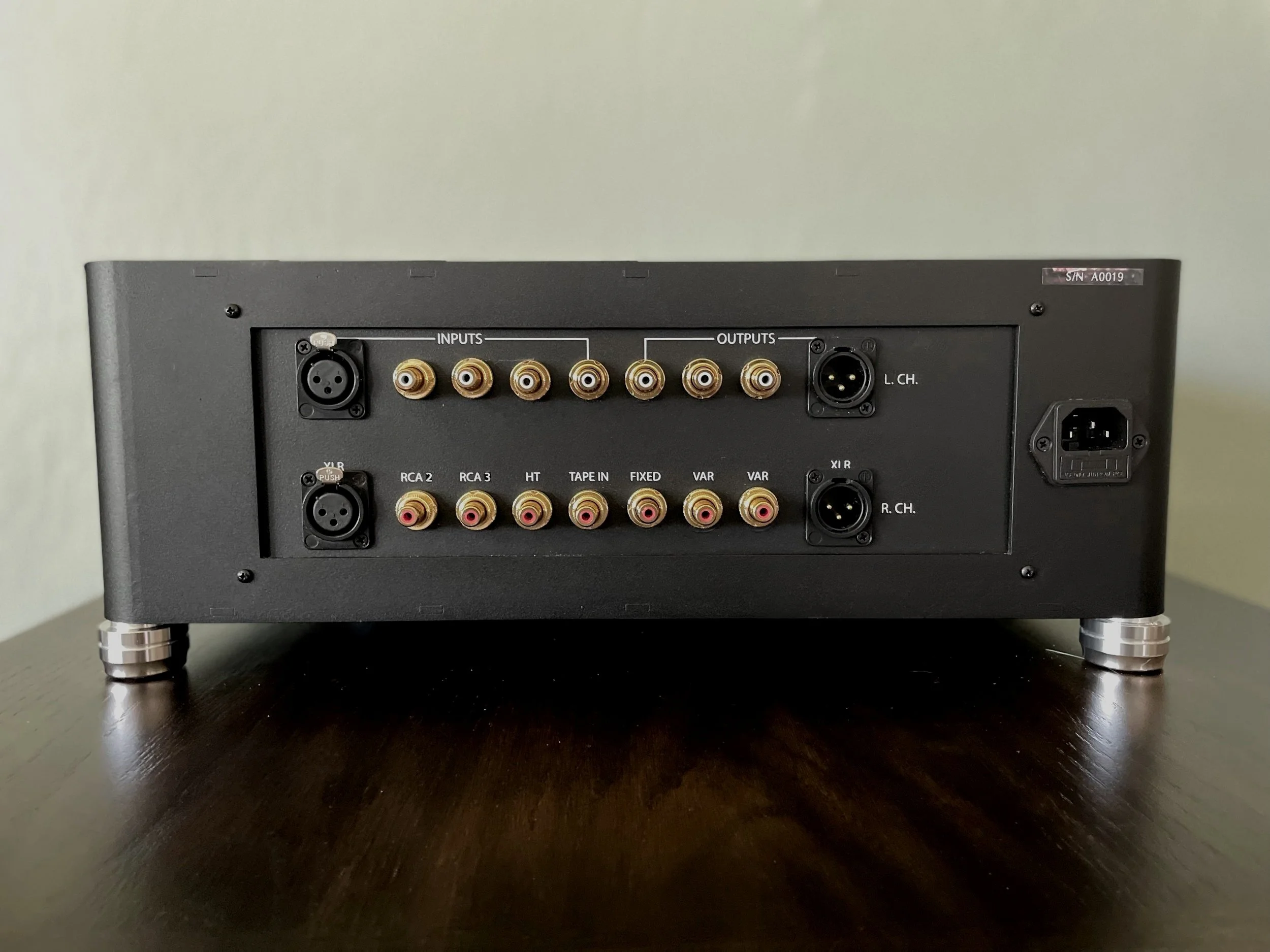 Inputs: 3 pairs RCA unbalanced, one pair XLR unbalanced, one pair Tape-in, one pair Home Theater Bypass RCAs unbalanced